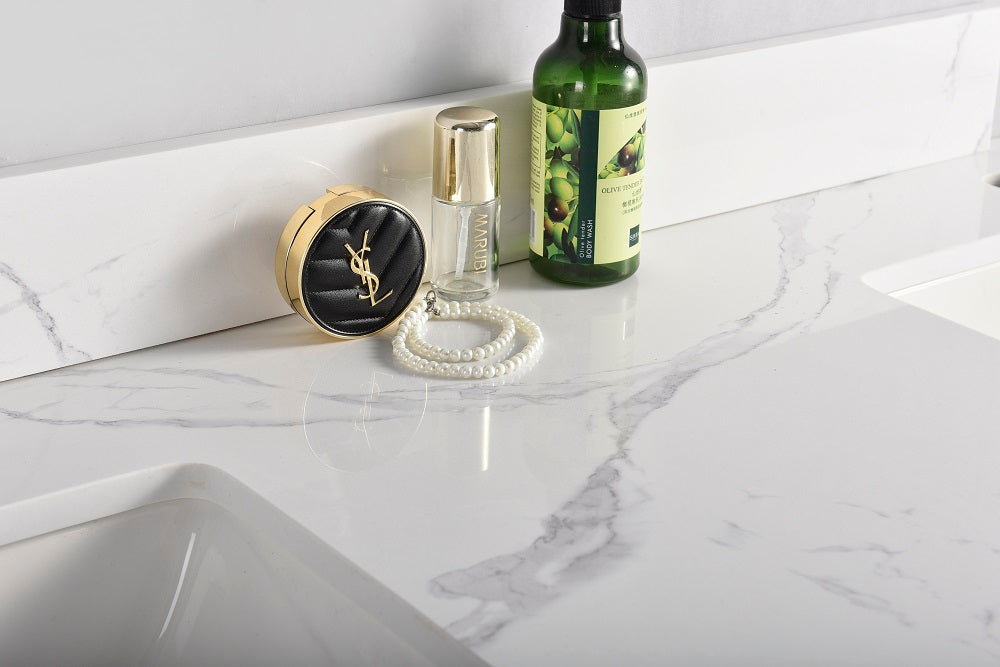 The freestanding bathroom vanity is an elegant and functional piece of furniture that adds style and organization to any bathroom space. Crafted from high-quality materials, its sleek design makes it a versatile addition to any bathroom decor style. The freestanding feature allows for easy installation without the need for complicated mounting or installation procedures. Enhance the look and functionality of your bathroom with this stylish and practical free-standing bathroom vanity. Featuring a smooth shaker for easy cleaning, quality quartz countertop with one predrilled hole for faucet for each sink and backsplash, and soft-closing hinges.