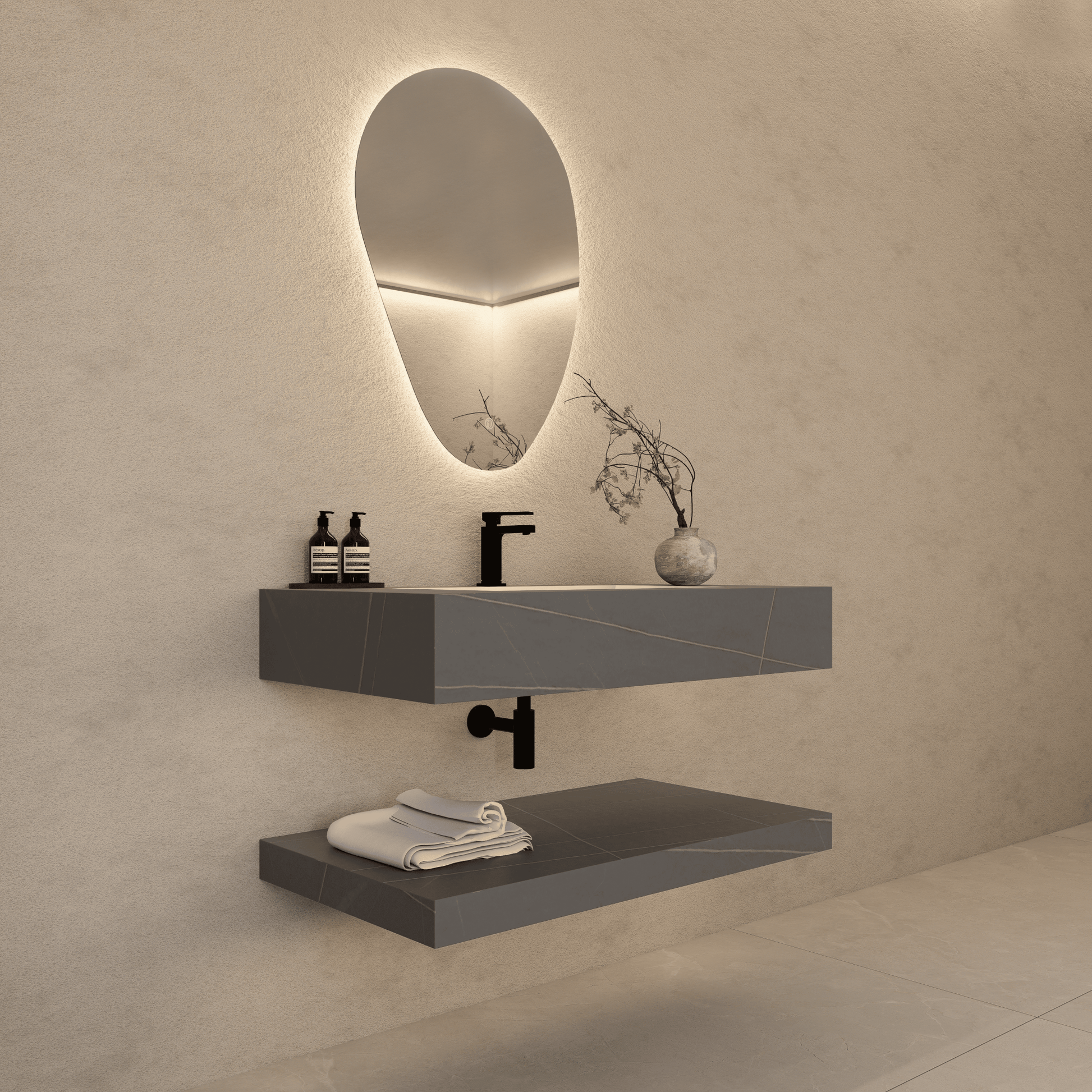 Sintered stone is a man-made “stone” top made by pressing natural minerals (like quartz and clay) under very high heat and pressure—kind of like how real stone forms, but in a controlled way. For your floating vanity, that means the countertop is very durable, handles heat and water well, and is easy to wipe clean—with the look of natural stone, but lower maintenance.