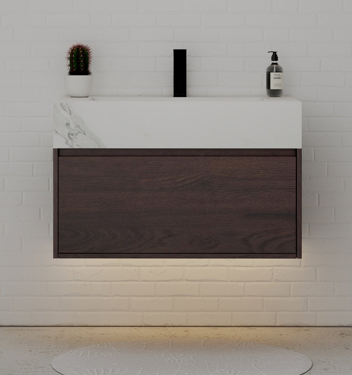 Sintered stone is a man-made “stone” top made by pressing natural minerals (like quartz and clay) under very high heat and pressure—kind of like how real stone forms, but in a controlled way. For your floating vanity, that means the countertop is very durable, handles heat and water well, and is easy to wipe clean—with the look of natural stone, but lower maintenance.