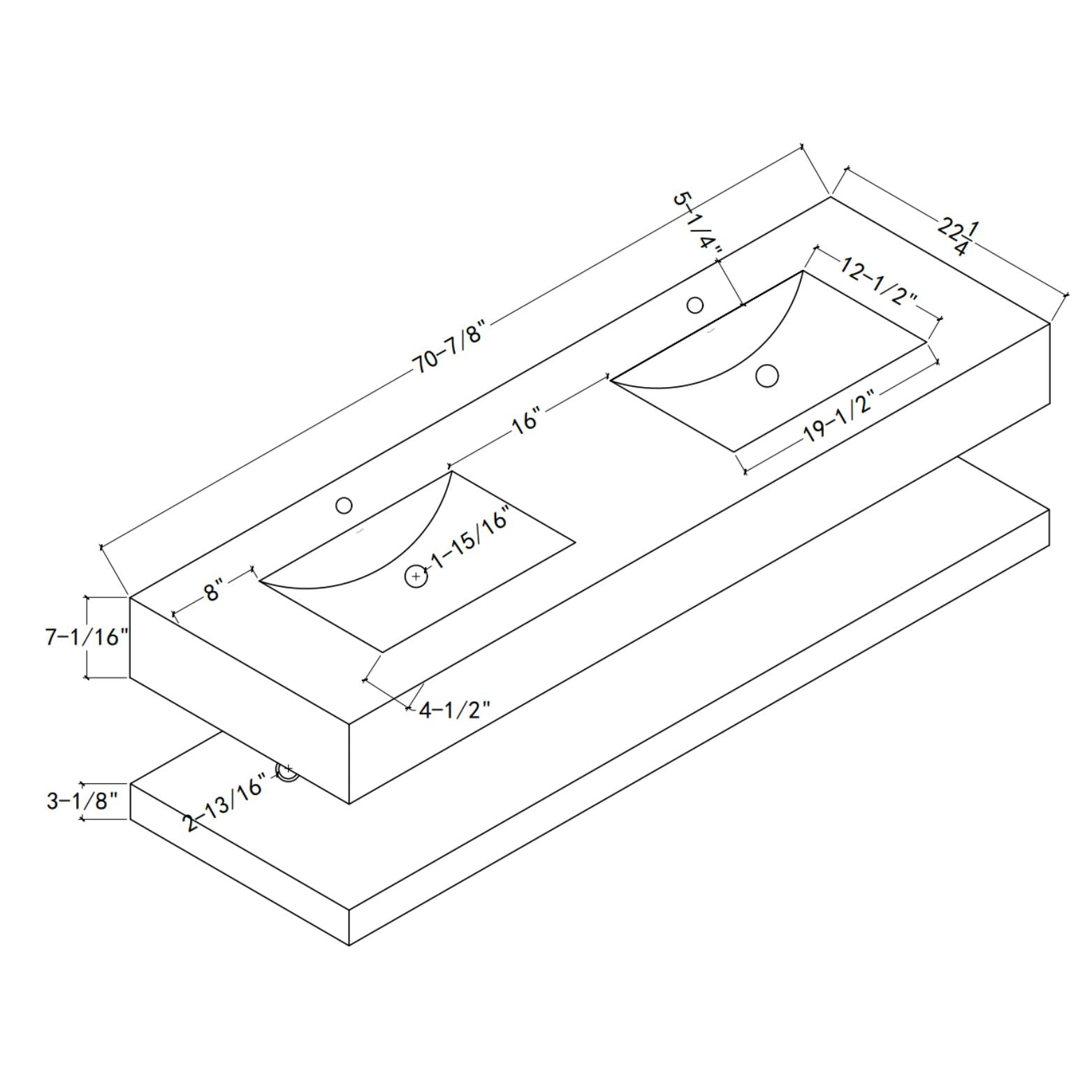 Lower: 70.9" × 22.2" × 3.1" (W×D×H)