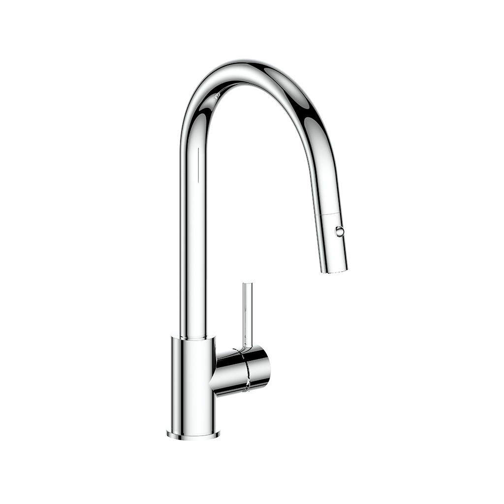 The sleek, minimal design of the Traun Pull-Down Kitchen Faucet elevates your kitchen style and everyday efficiency. Convenient spray head. Faucet has a rounded curve.