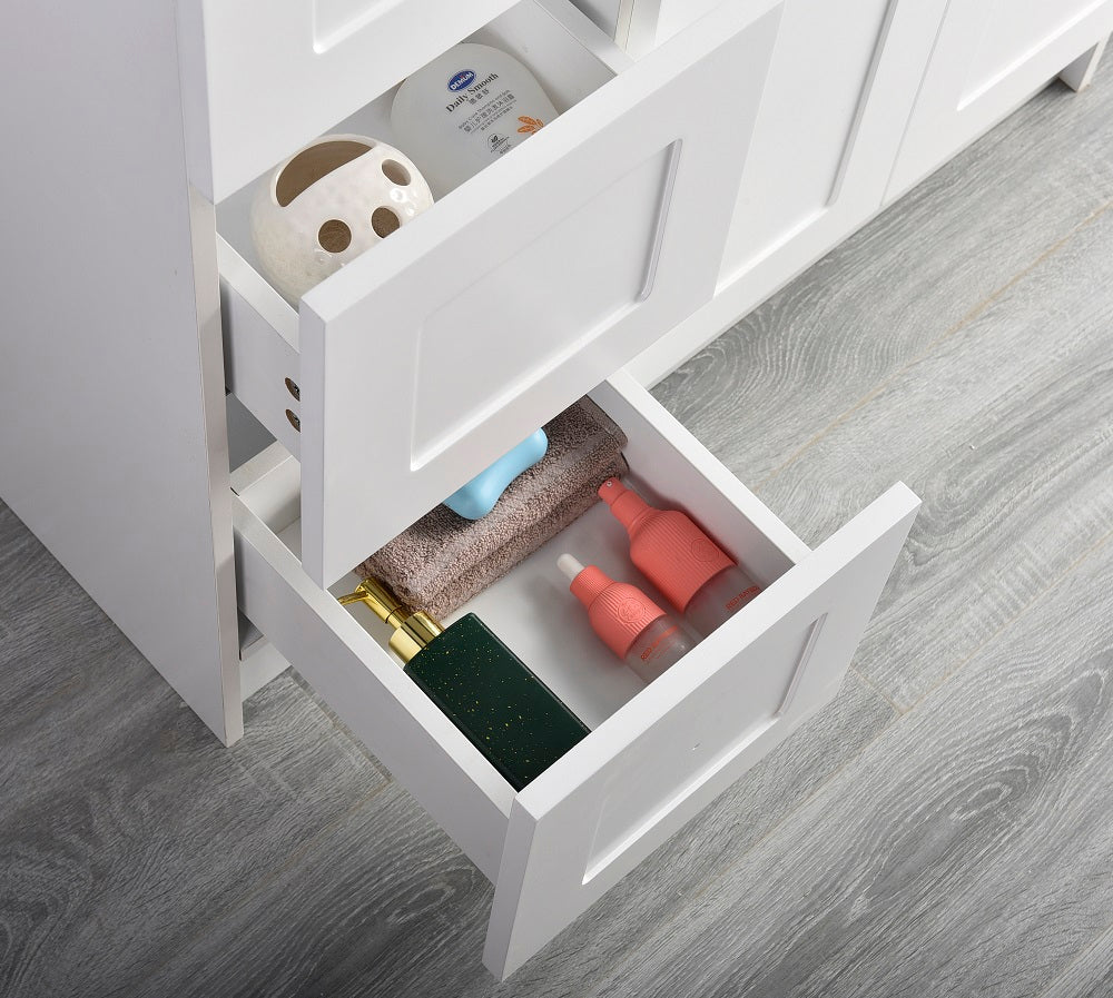 The freestanding bathroom vanity is an elegant and functional piece of furniture that adds style and organization to any bathroom space. Crafted from high-quality materials, its sleek design makes it a versatile addition to any bathroom decor style. The freestanding feature allows for easy installation without the need for complicated mounting or installation procedures. Enhance the look and functionality of your bathroom with this stylish and practical free-standing bathroom vanity. Featuring a smooth shaker for easy cleaning, quality quartz countertop with one predrilled hole for faucet and backsplash, and soft-closing hinges.