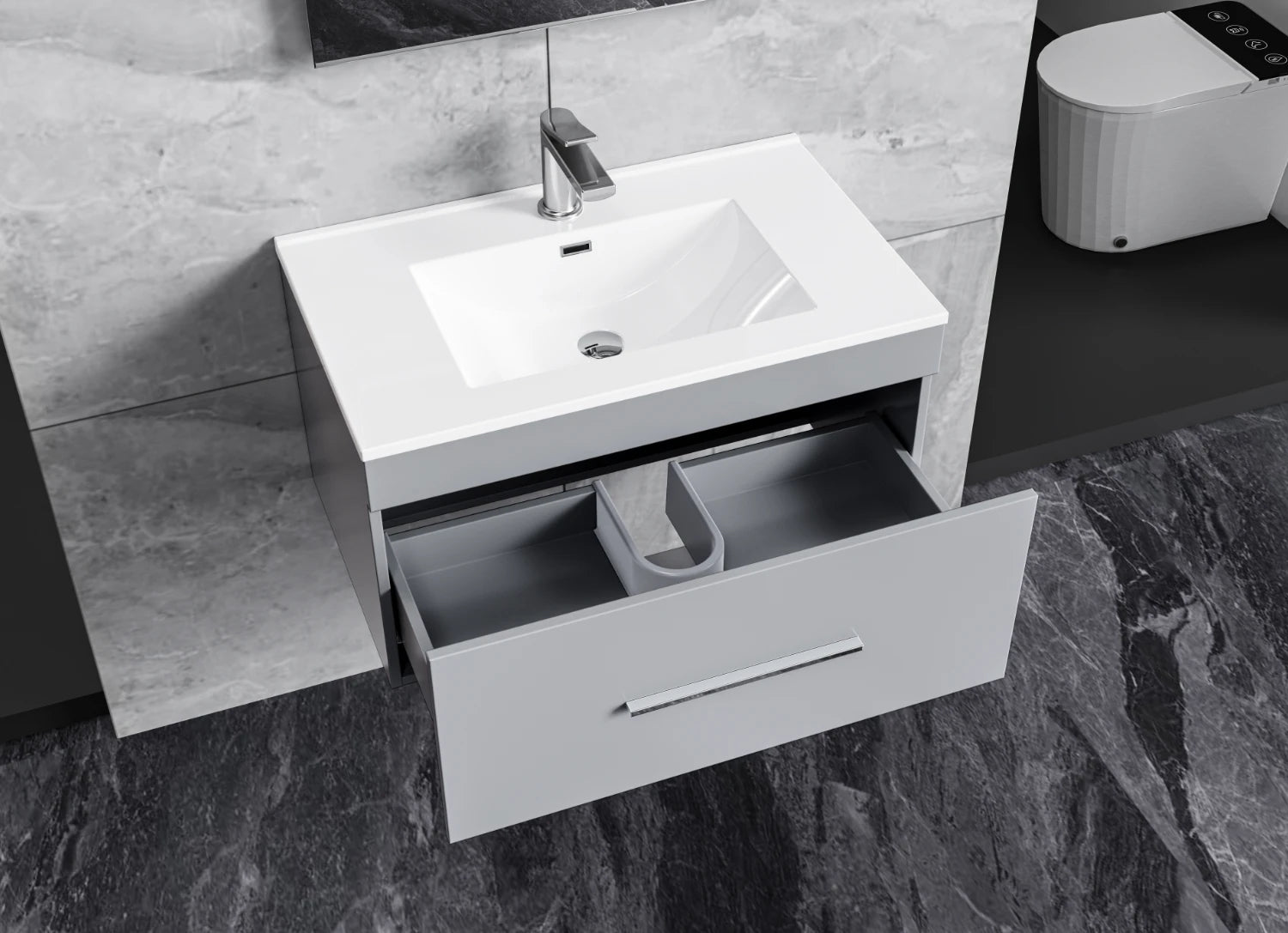 This 24” wall-mounted modern vanity combines contemporary design with premium functionality. Designed for both style and durability, this vanity is a perfect addition to any modern bathroom. Cabinet has pull out, u-shaped, soft-close drawer. The acrylic countertop and integrated sink create a truly seamless finish, great for cleaning and gives the appearance of a single piece.