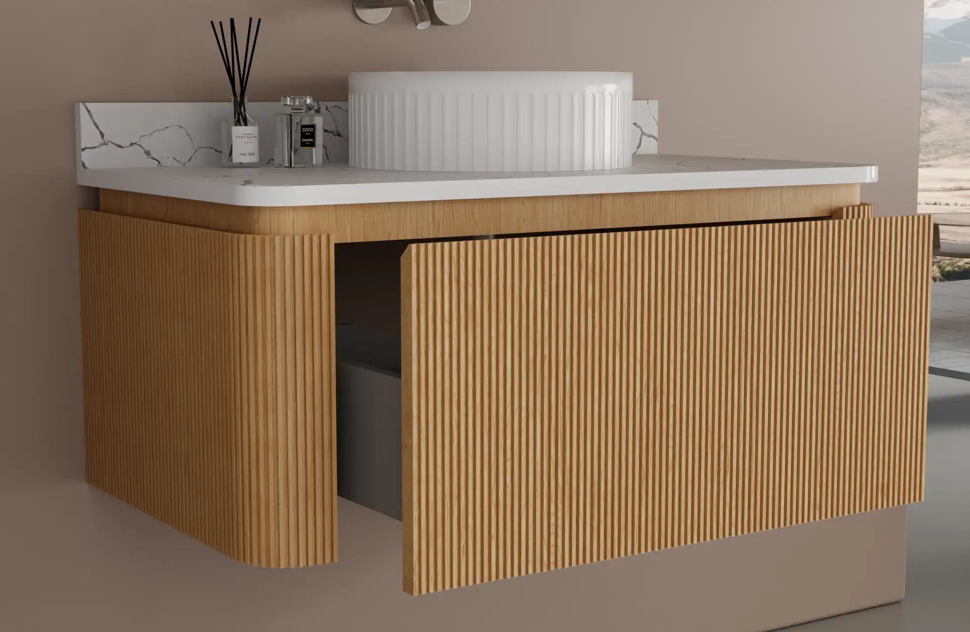 Quartz countertop with veining included. White Fluted Vessel sink included.