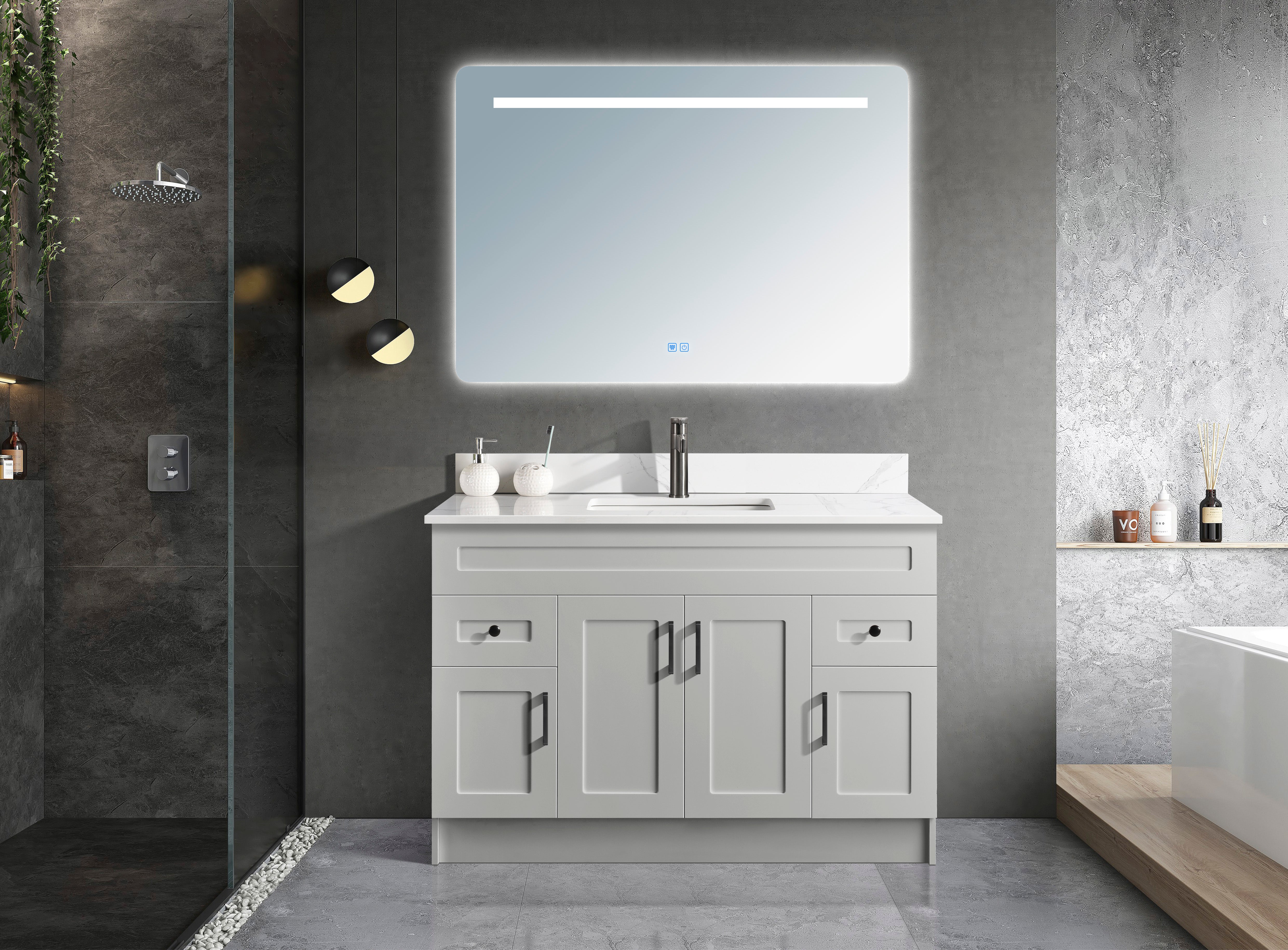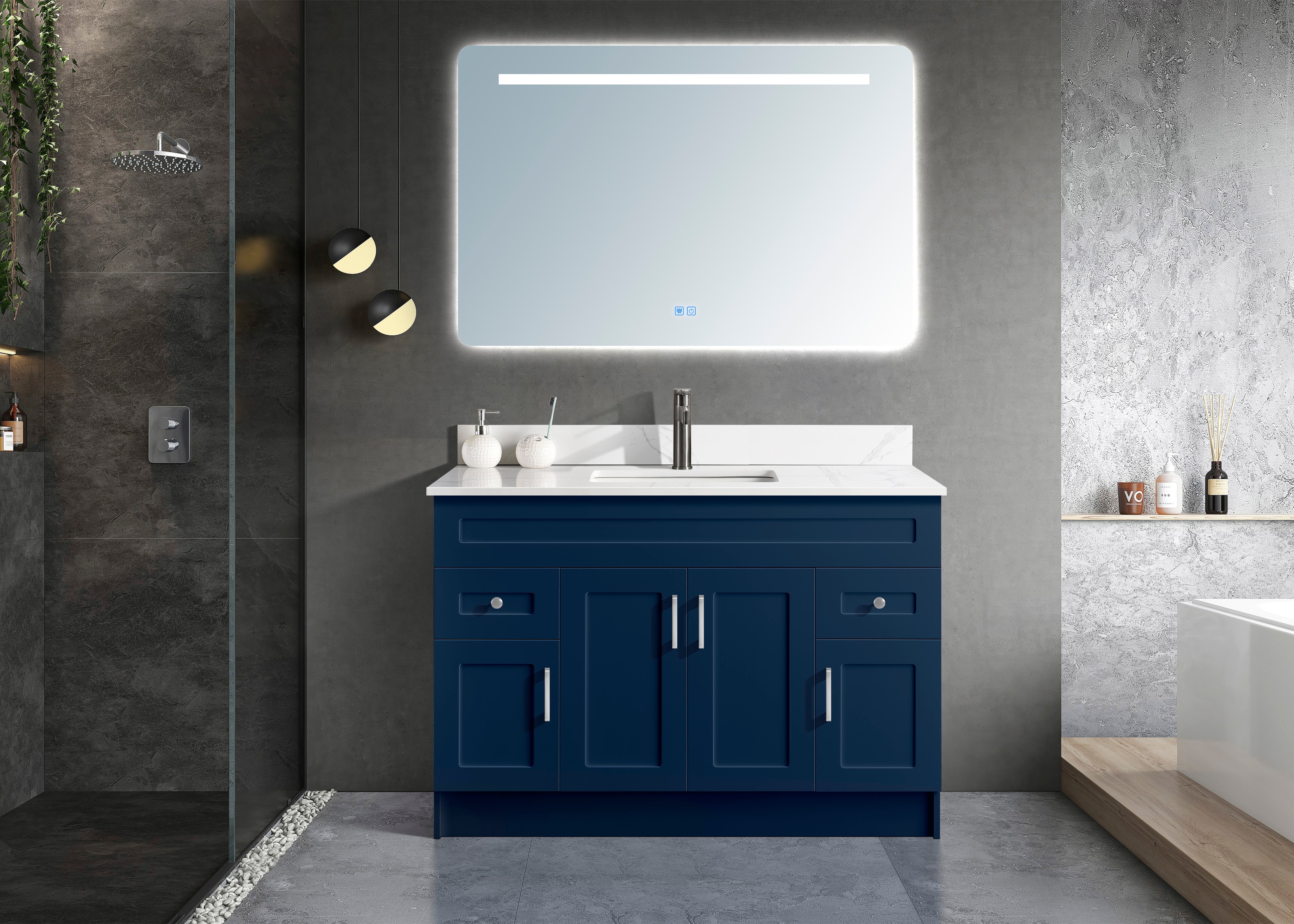 The freestanding bathroom vanity is an elegant and functional piece of furniture that adds style and organization to any bathroom space. Crafted from high-quality materials, its sleek design makes it a versatile addition to any bathroom decor style. The freestanding feature allows for easy installation without the need for complicated mounting or installation procedures. Enhance the look and functionality of your bathroom with this stylish and practical free-standing bathroom vanity. Featuring a smooth shaker for easy cleaning, quality quartz countertop, ceramic under-mount sink with single predrilled hole for faucet and backsplash, and soft-closing hinges.