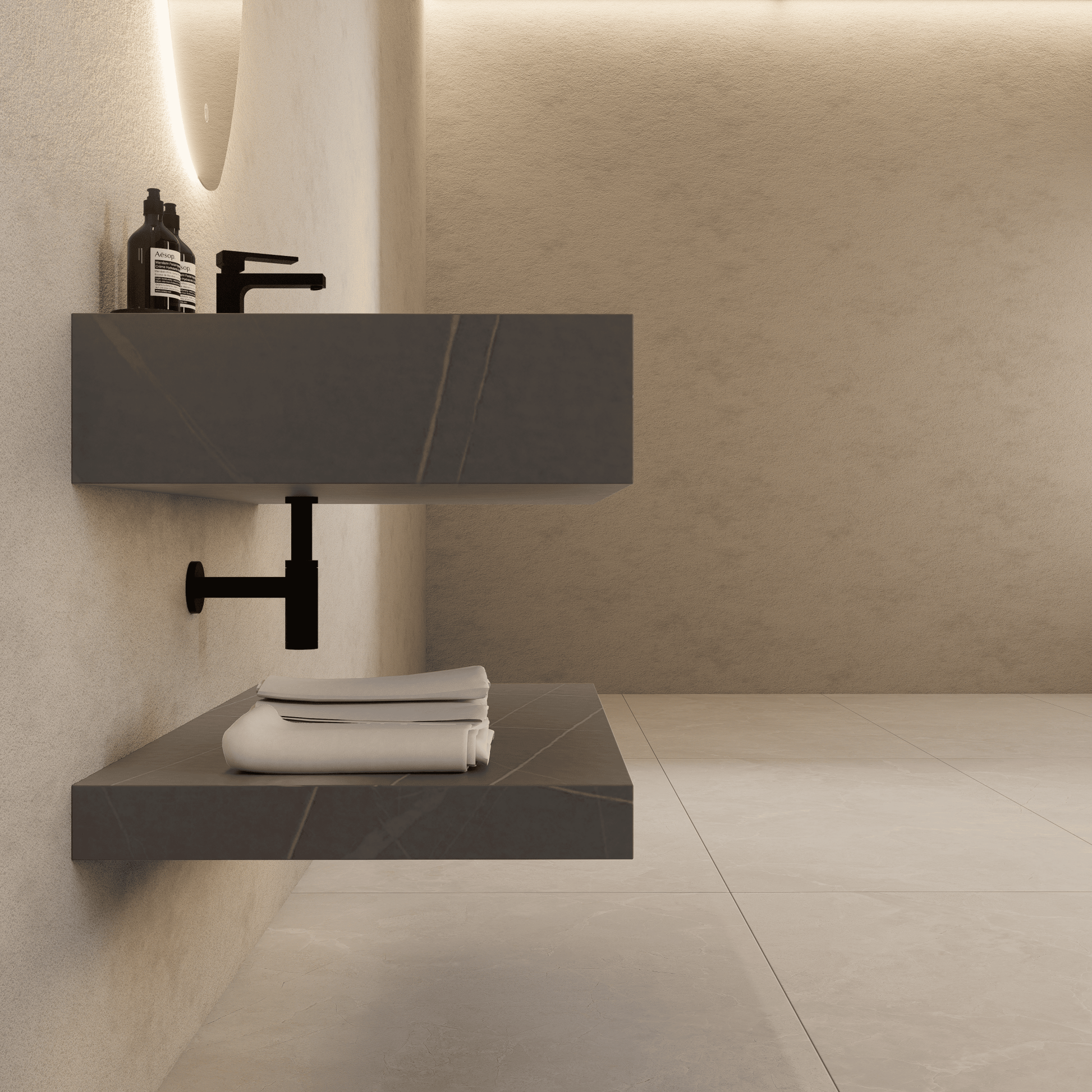 Material: Sintered stone countertop with seamless integrated ceramic sinks