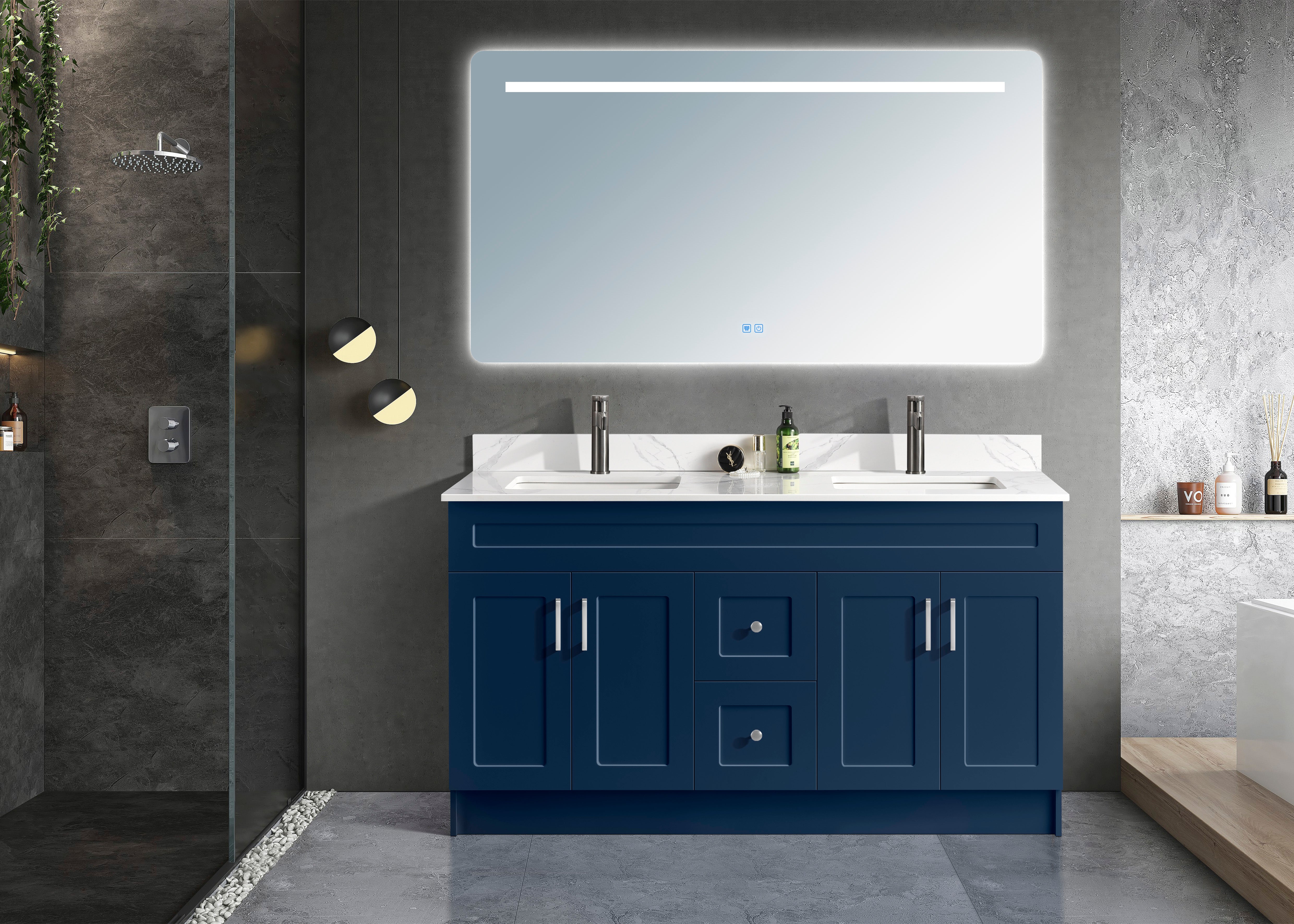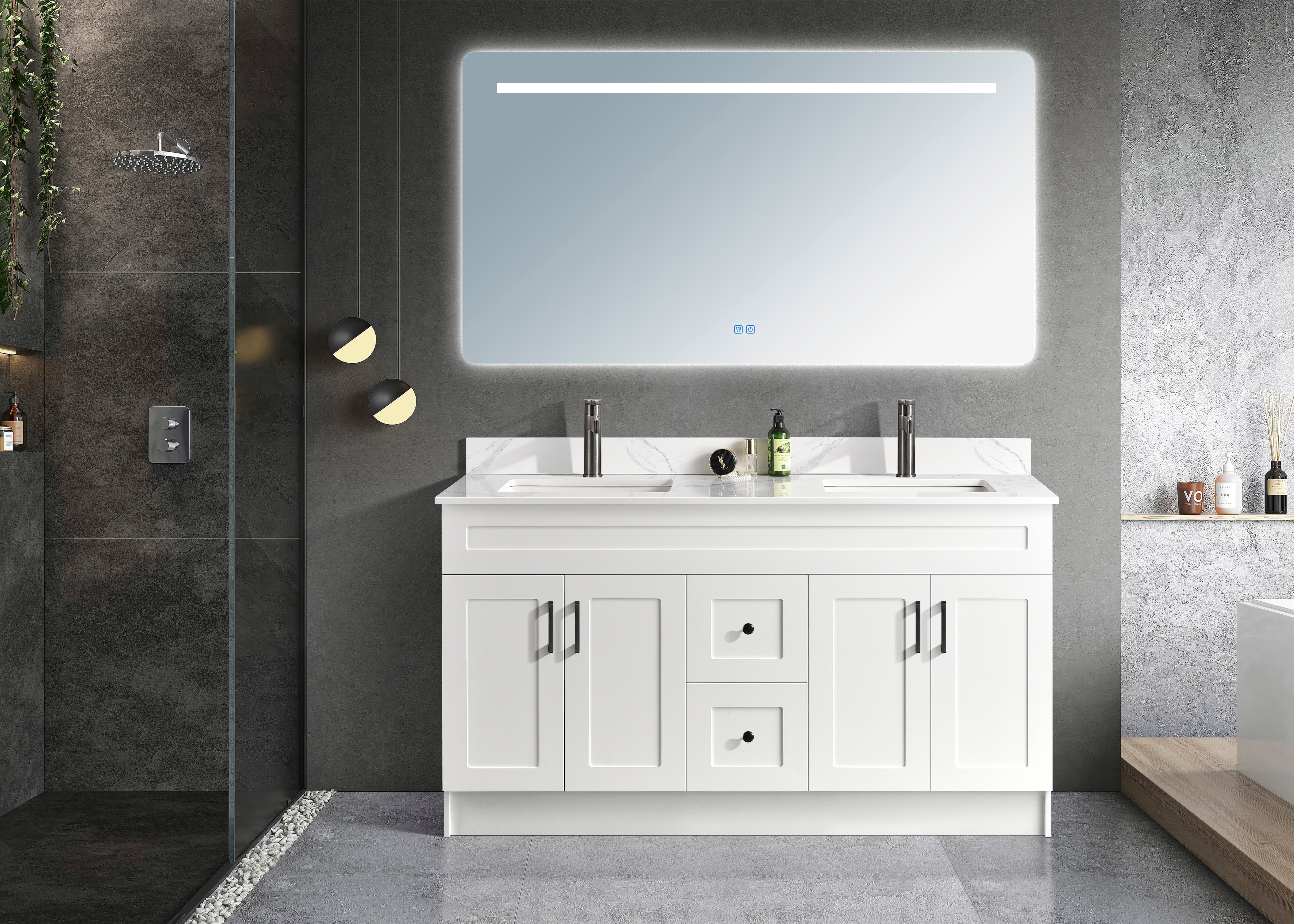 The freestanding bathroom vanity is an elegant and functional piece of furniture that adds style and organization to any bathroom space. Crafted from high-quality materials, its sleek design makes it a versatile addition to any bathroom decor style. The freestanding feature allows for easy installation without the need for complicated mounting or installation procedures. Enhance the look and functionality of your bathroom with this stylish and practical free-standing bathroom vanity. Featuring a smooth shaker for easy cleaning, quality quartz countertop, ceramic under-mount sink with single predrilled hole for faucet and backsplash, and soft-closing hinges.