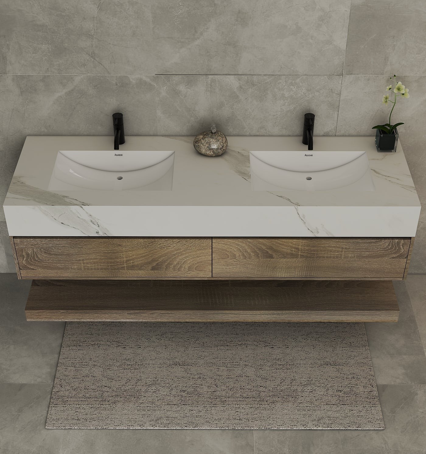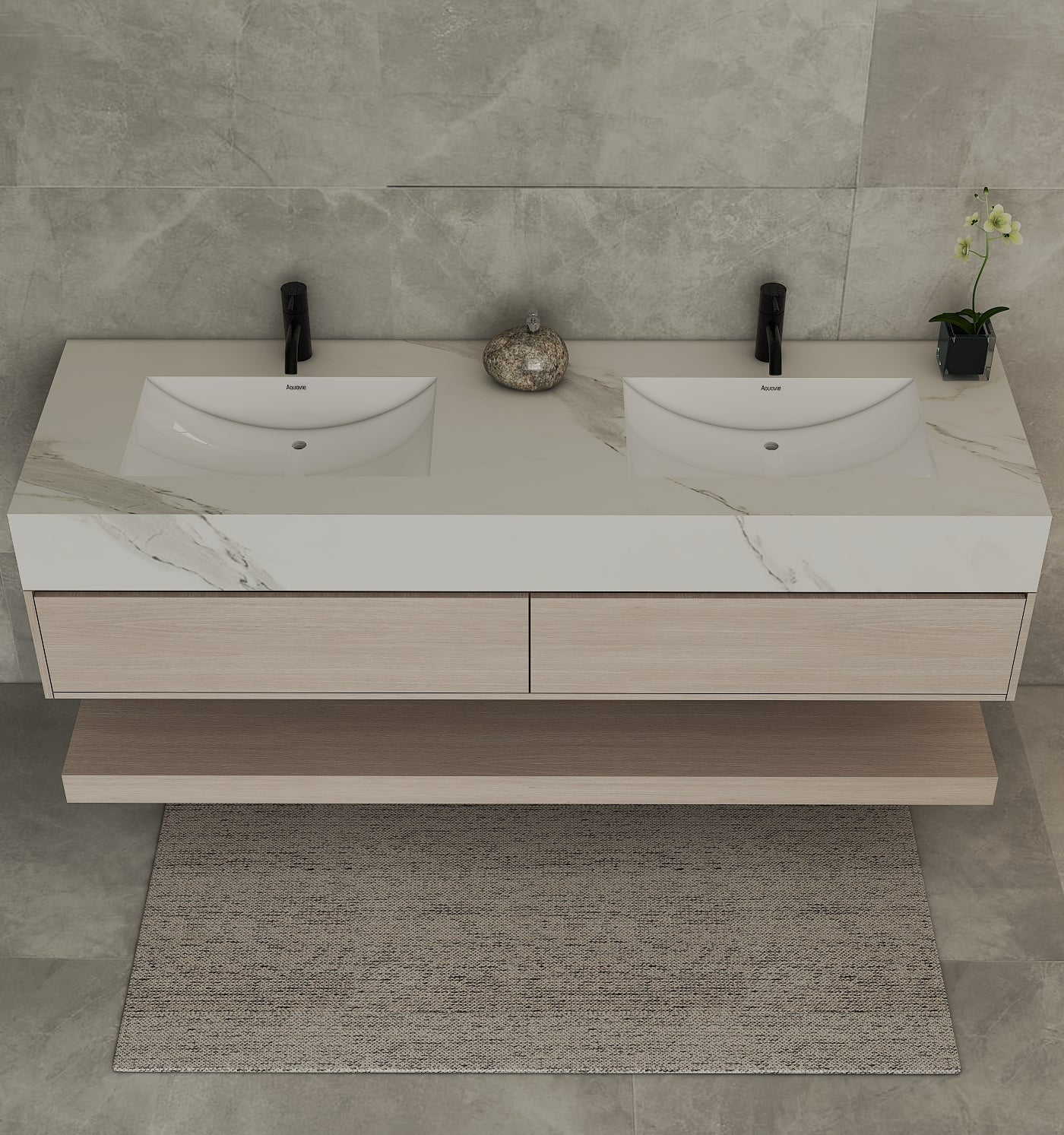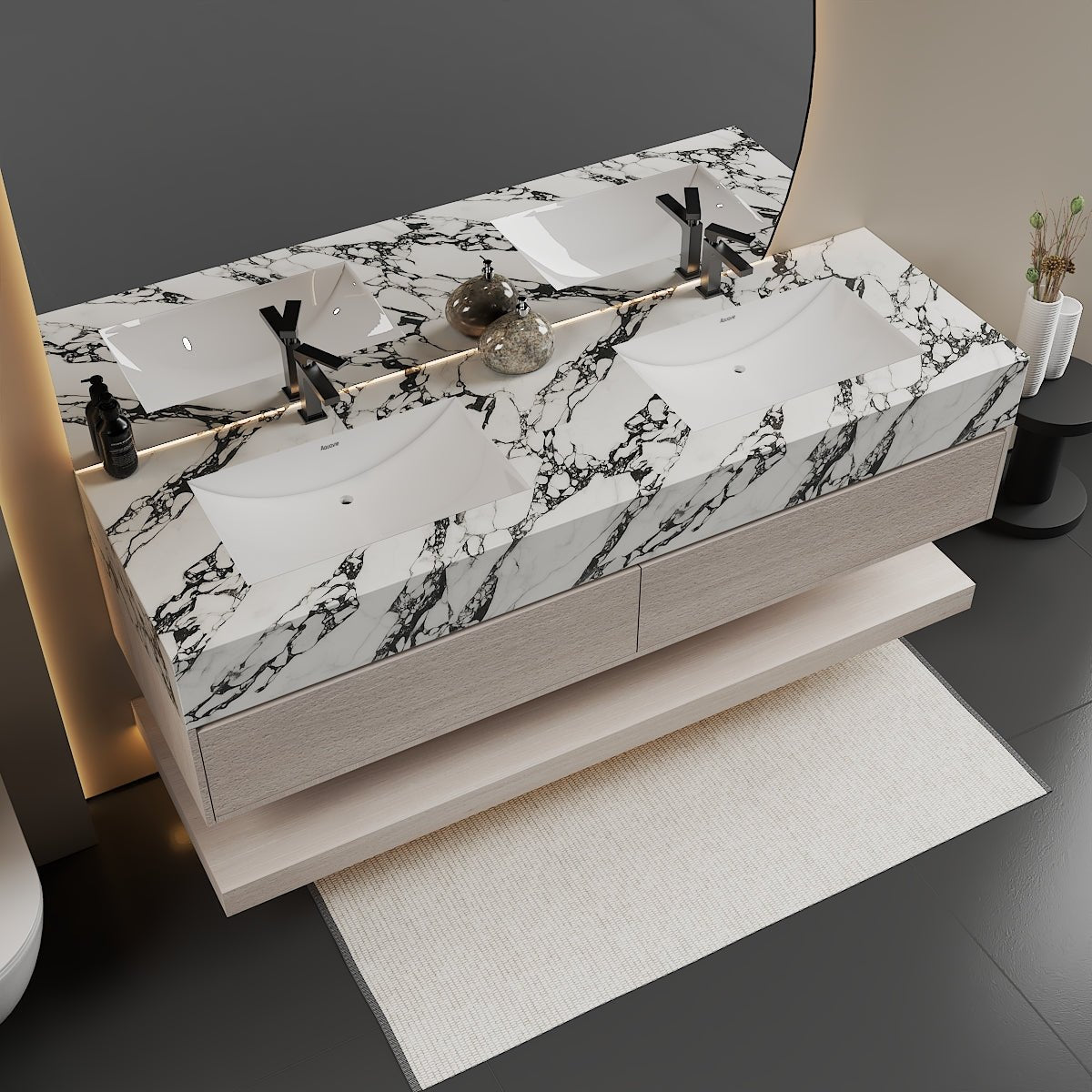 Material: Sintered stone countertop with seamless integrated ceramic sinks