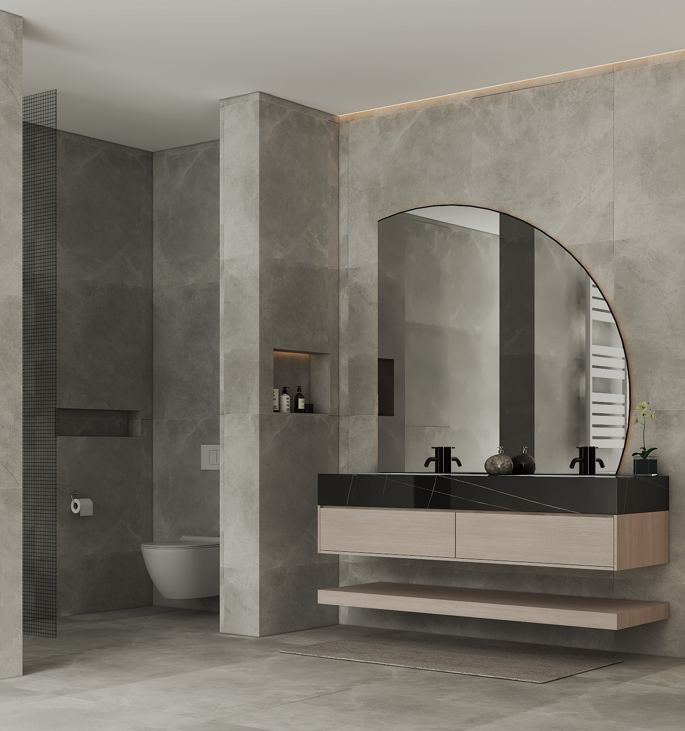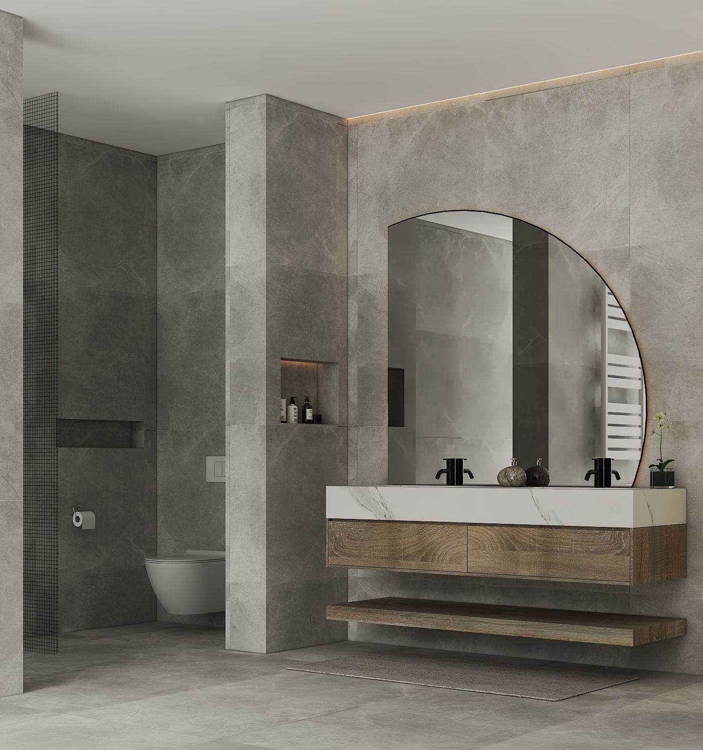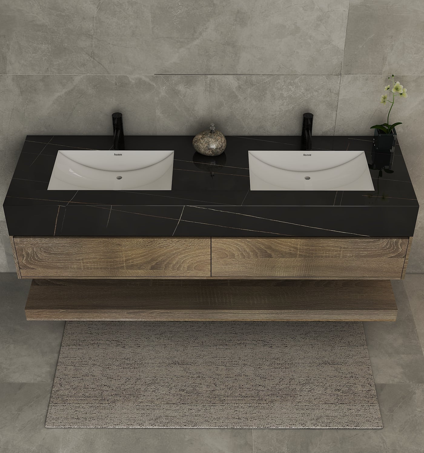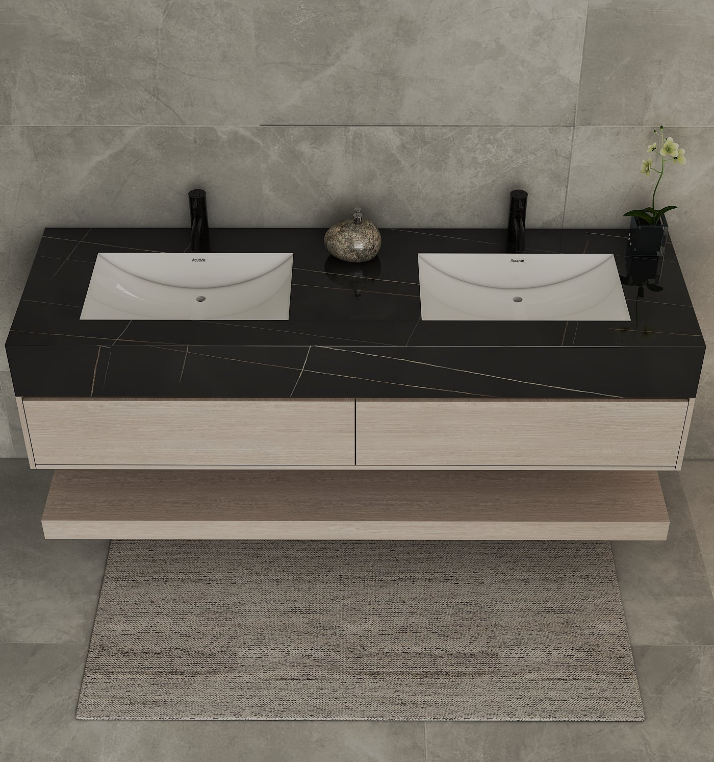 Material: Sintered stone countertop with seamless integrated ceramic sinks