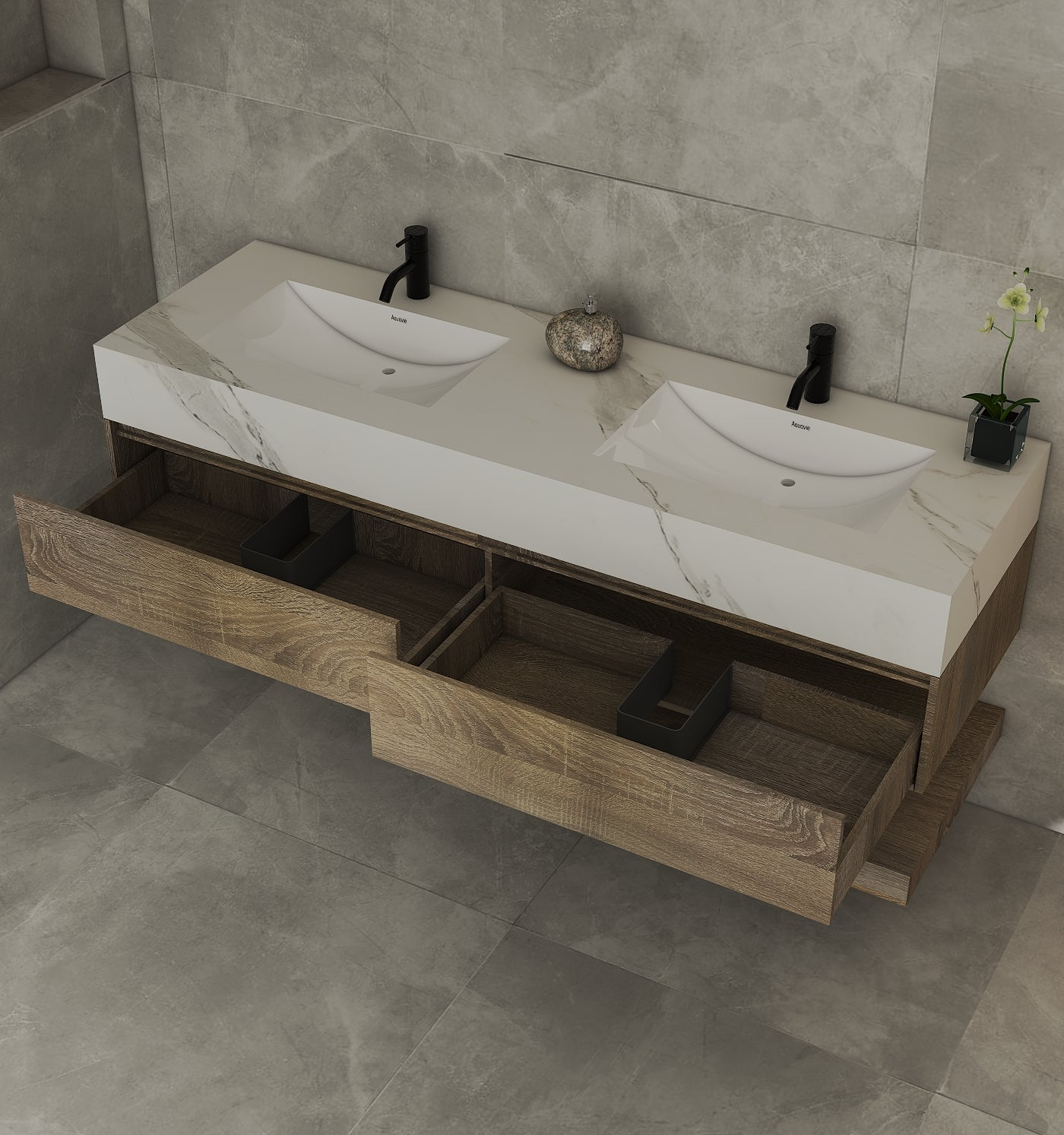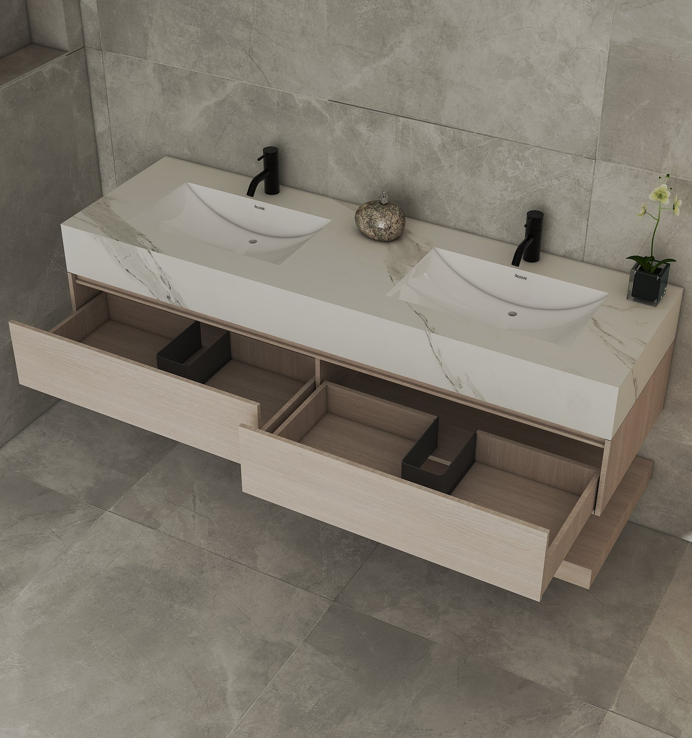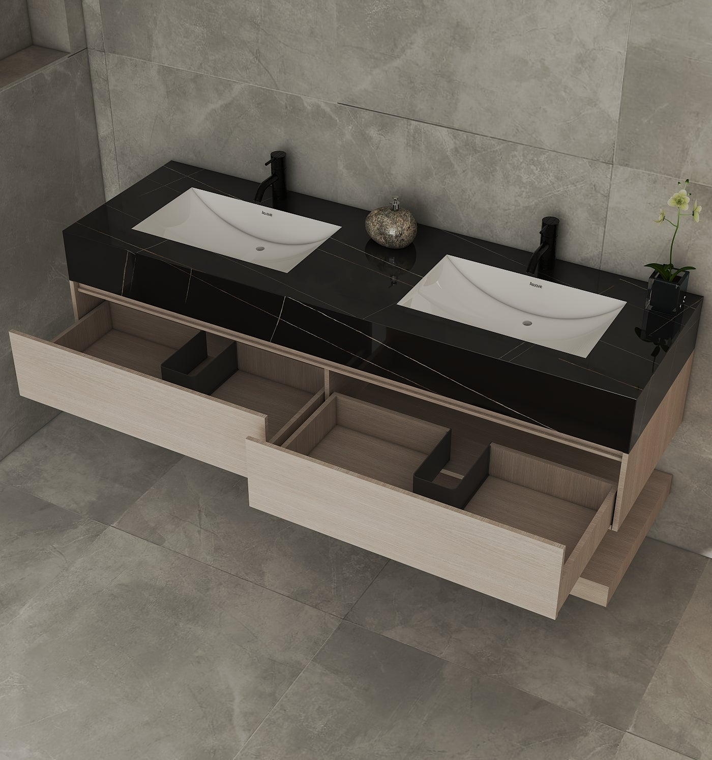Sintered stone is a man-made “stone” top made by pressing natural minerals (like quartz and clay) under very high heat and pressure—kind of like how real stone forms, but in a controlled way. For your floating vanity, that means the countertop is very durable, handles heat and water well, and is easy to wipe clean—with the look of natural stone, but lower maintenance.